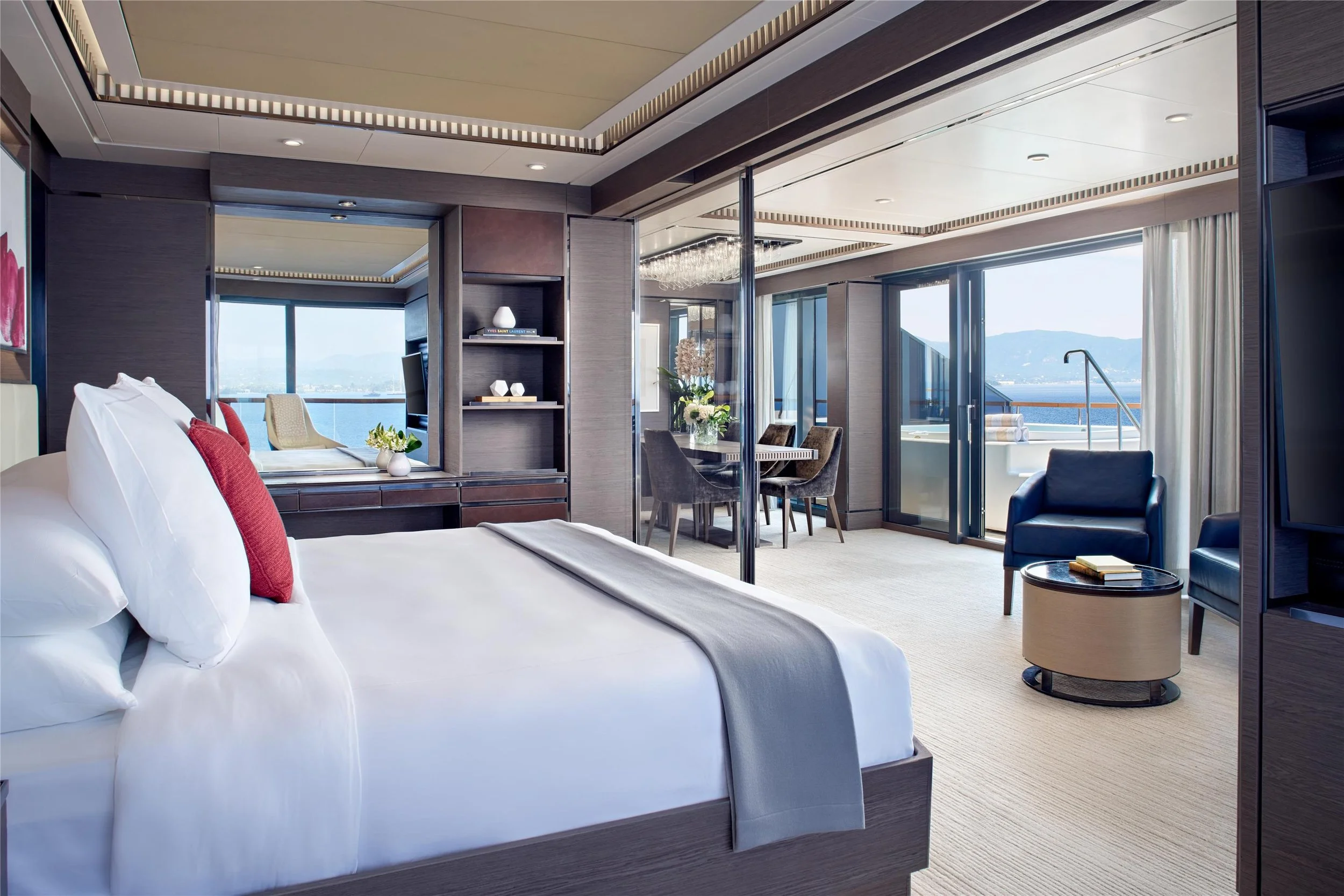 From the moment you step on board, the interiors speak to a sensibility aligned with today’s luxury traveler – sophisticated, minimalist, and deeply comfortable. Each suite is designed with soft neutrals, clean lines, and floor-to-ceiling windows that frame the ocean like a living painting. Private terraces, marble-accented bathrooms, walk-in wardrobes, and ambient lighting complete the atmosphere.