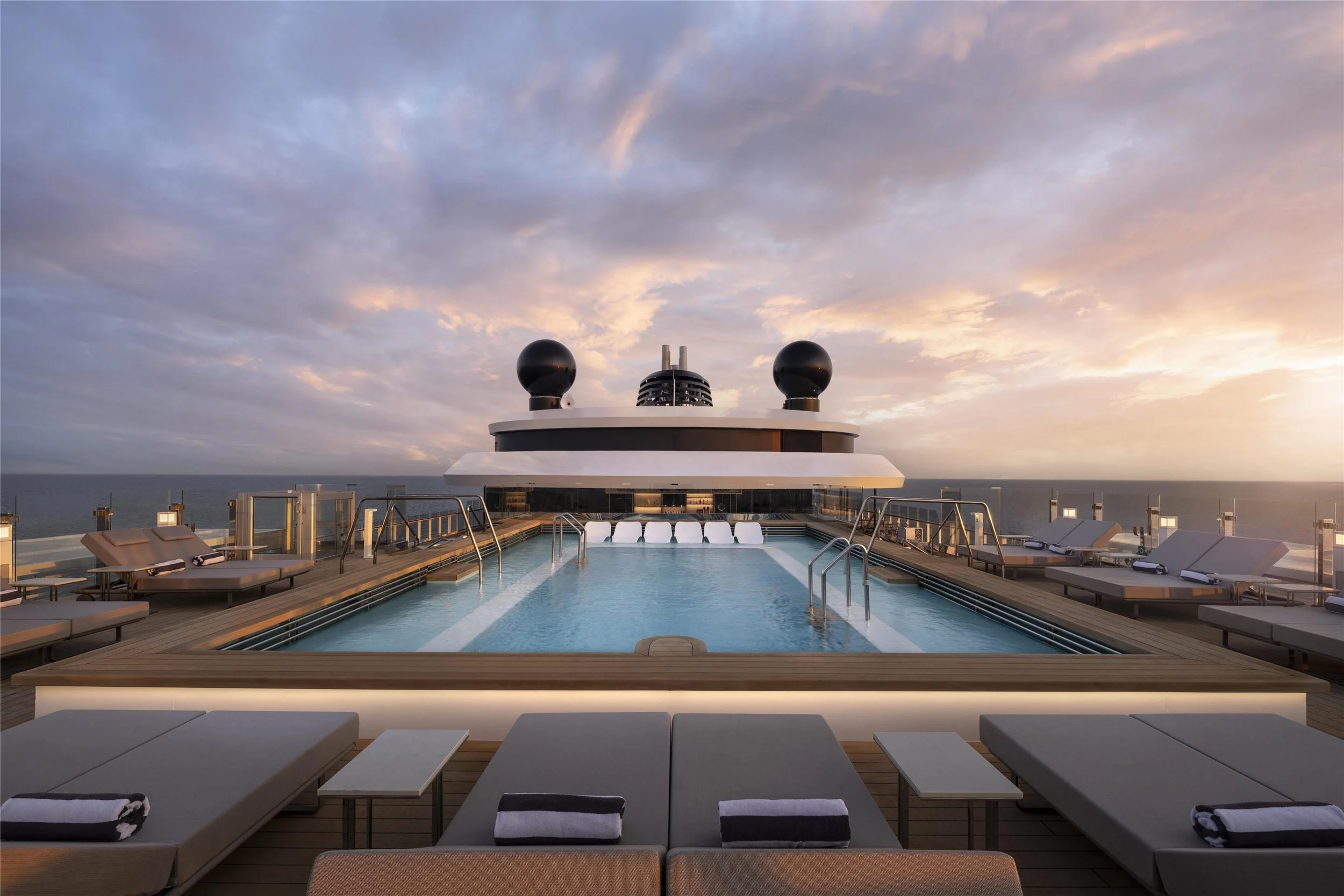 Ilma: Accommodating 448 guests, Ilma expands on the signature elements of Evrima with a more spacious pool deck, elevated wellness areas, and generously sized suites ideal for longer journeys.